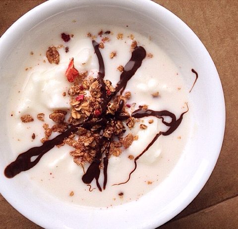 alors avec du yaourt ca va pas marcher parce que le yaourt va cuire, il faut vraiment un lait (de noisette si tu veux), et la confiture va jurer avec le gout je pense, mais tu peux essayer 🙂